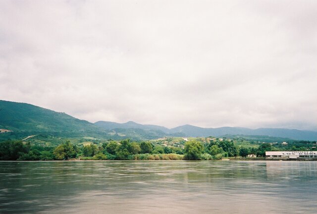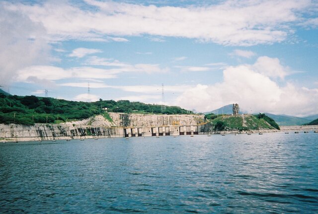 Za kaňonem se z přehrady vylévá hnědá, rychle tekoucí řeka. Převýšení přehrady je 260 metrů.