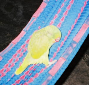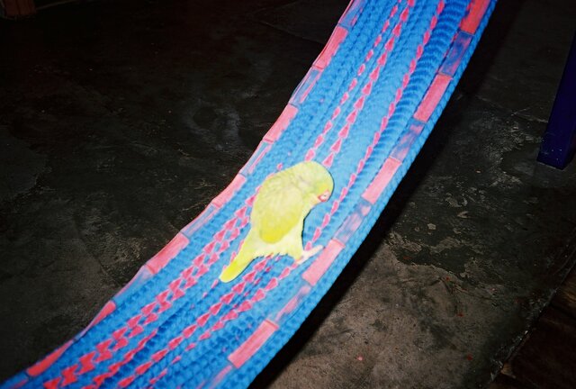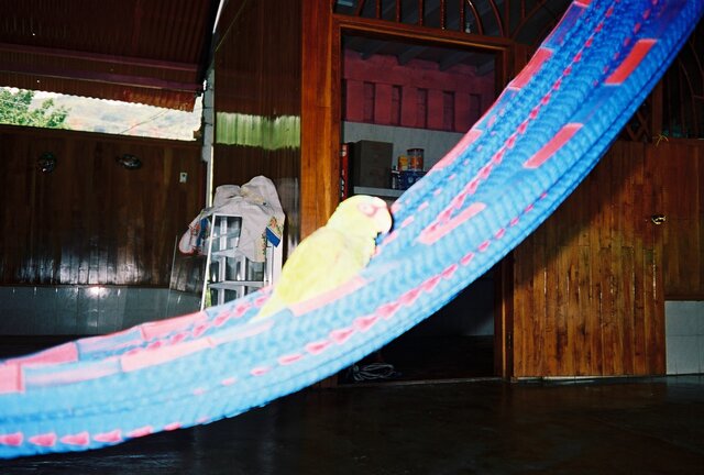 Součástí byl i papoušek, který se nechal v klidu fotit, jen škoda, že z mýho foťáku to nevyšlo moc pěkně. Papoušek seděl na hamaku a tvářil se, že je jeho. Když do něj někdo vlezl, tak nabručeně odešel, ke konci zavěšení. Tam si to nějak rozmyslel a lezl zpátky s výhrůžným mručením a nadáváním, až troufalce vyhnal.