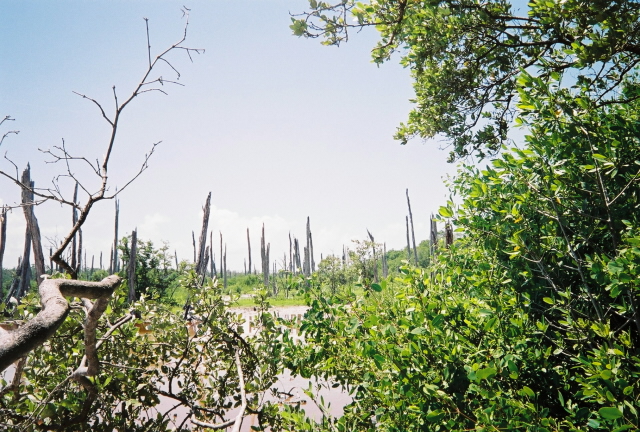 (v popředí mangrovy, vzadu zbytky sladkovodních stromů)