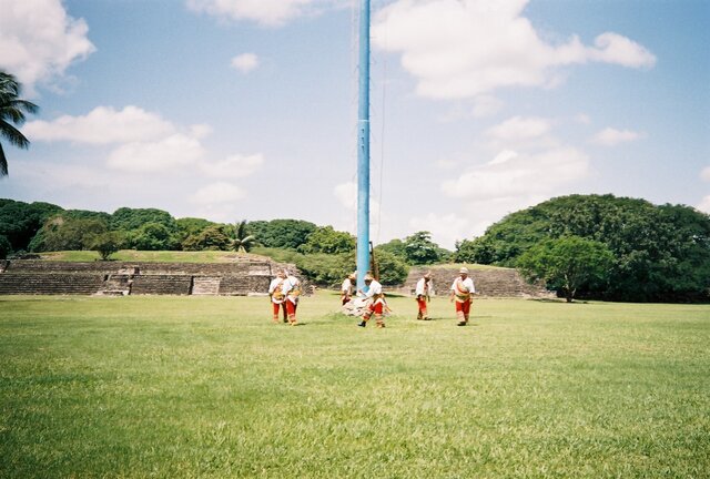 A pak zazní jeden tón, po němž voladores přepadávají zády do volného prostoru, beze slov a bez výkřiků roztahují paže jako křídla ptáků. Letí. Je to prostě nádhera. Pak pomaloučku roztáčejí čtvercový rám a začínají klesat, opisujíce ve spirále stále větší a větší kruhy. Za pár chvil přistávají.