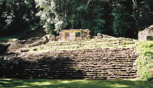 Dojeli jsme na konec silnice a podle průvodce jsme se měli dostat do archeologické zóny lodí. No všichni jsme si mysleli, že nás jen převezou, konec silnice byl totiž u řeky. Až na lodi jsme se dozvěděli, že cesta trvá hodinu a jede se protiproudu řeky. Jinak na druhém břehu je Guatemala. Cesta lodí byla příjemná, řeka byla trochu rozvodněná (holt období dešťů), a náš lodivod José nás cestou upozorňoval na zvířátka na stromech, tedy převážně opice. Vysadil nás u památek a spolu s ostatníma lodivodama, co přivezli jiné turisty čekal až se vrátíme.