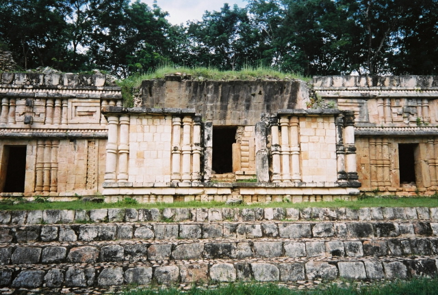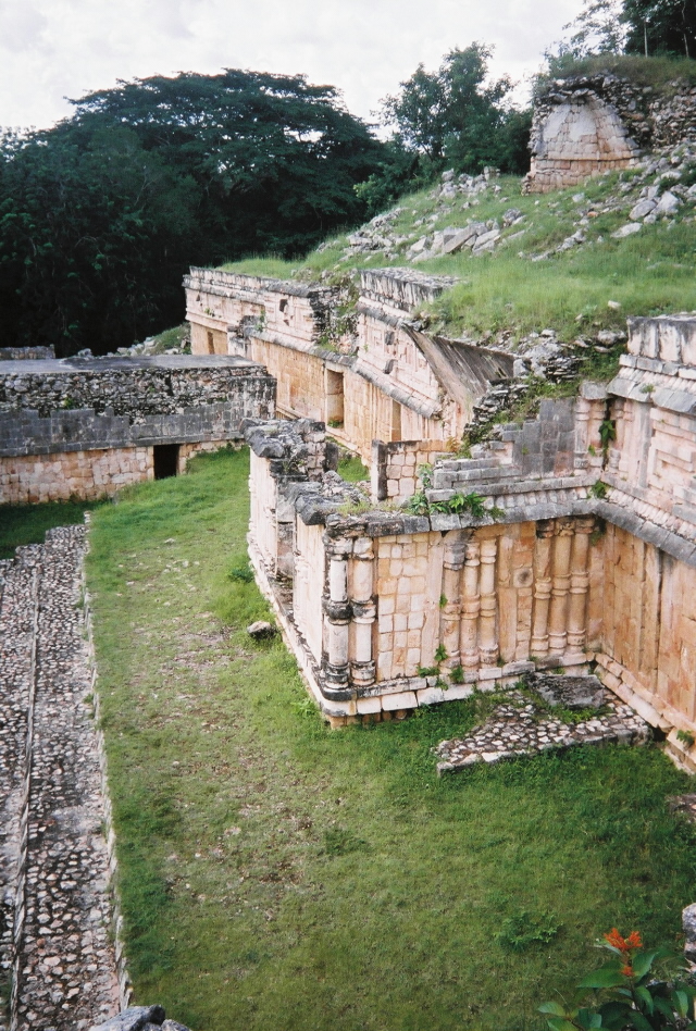 Na západním rohu hlavního průčelí, přímo proti velikému stromu v centru komplexu je hadí hlava s lidskou tváří hledící z jejích čelistí, symbol planety Venuše. Odsud směrem ke kopci je působivá maska Chakaa poblíž dolní polovina lidské postavy (možná hráče míčové hry) v bederní roušce a kamaších.