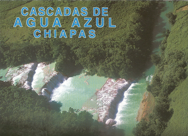 Odbočka ke skvělým vodopádům Agua Azul je zhruba na půli cesty mezi Ocosingem a Palenque. Množství třpytící se vody padá do tyrkysových jezírek obklopených džunglí. Krásná modř vody, která místu dala jméno, bývá zjevná jenom v dubnu a květnu. V jiné měsíce může být voda zkalená.